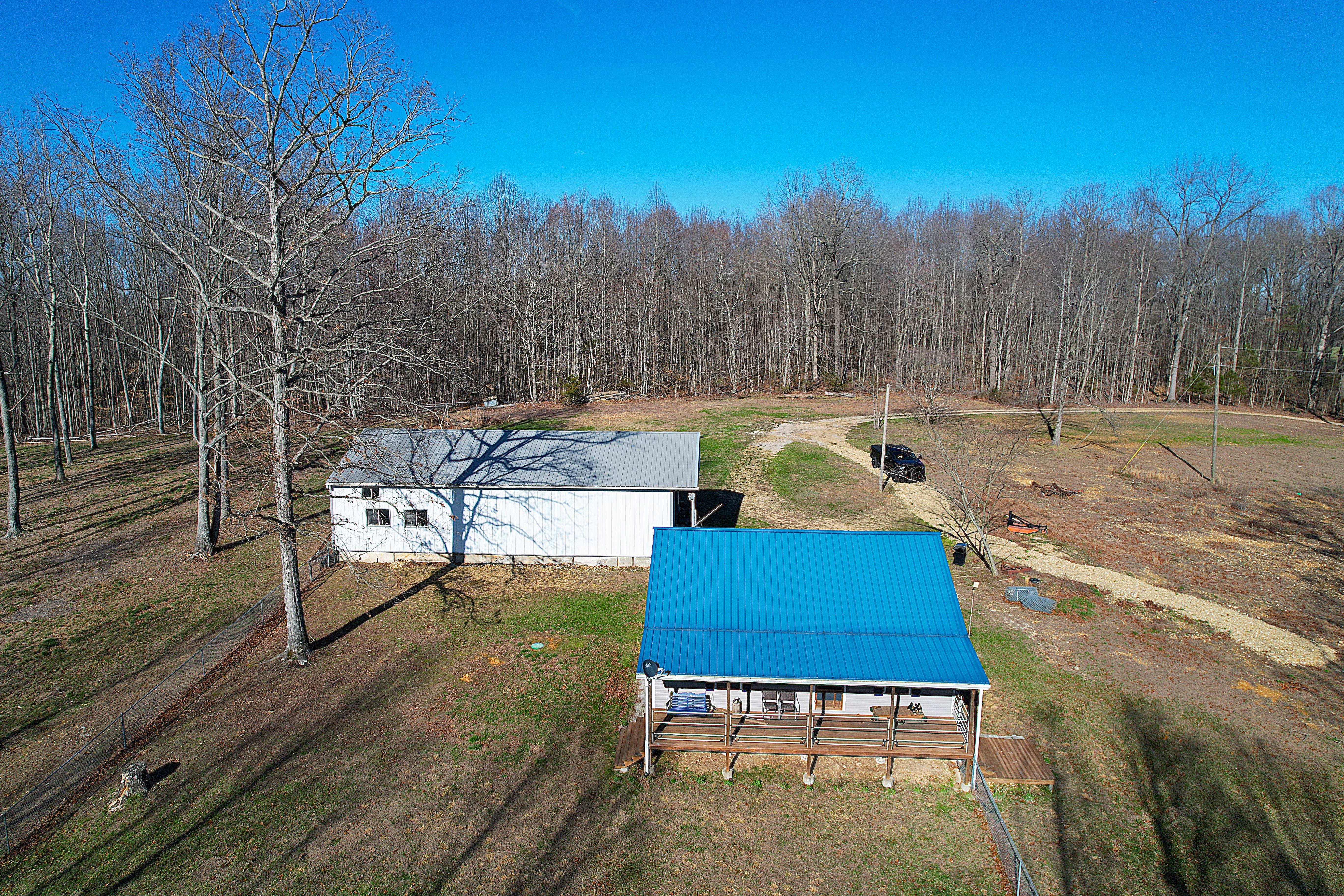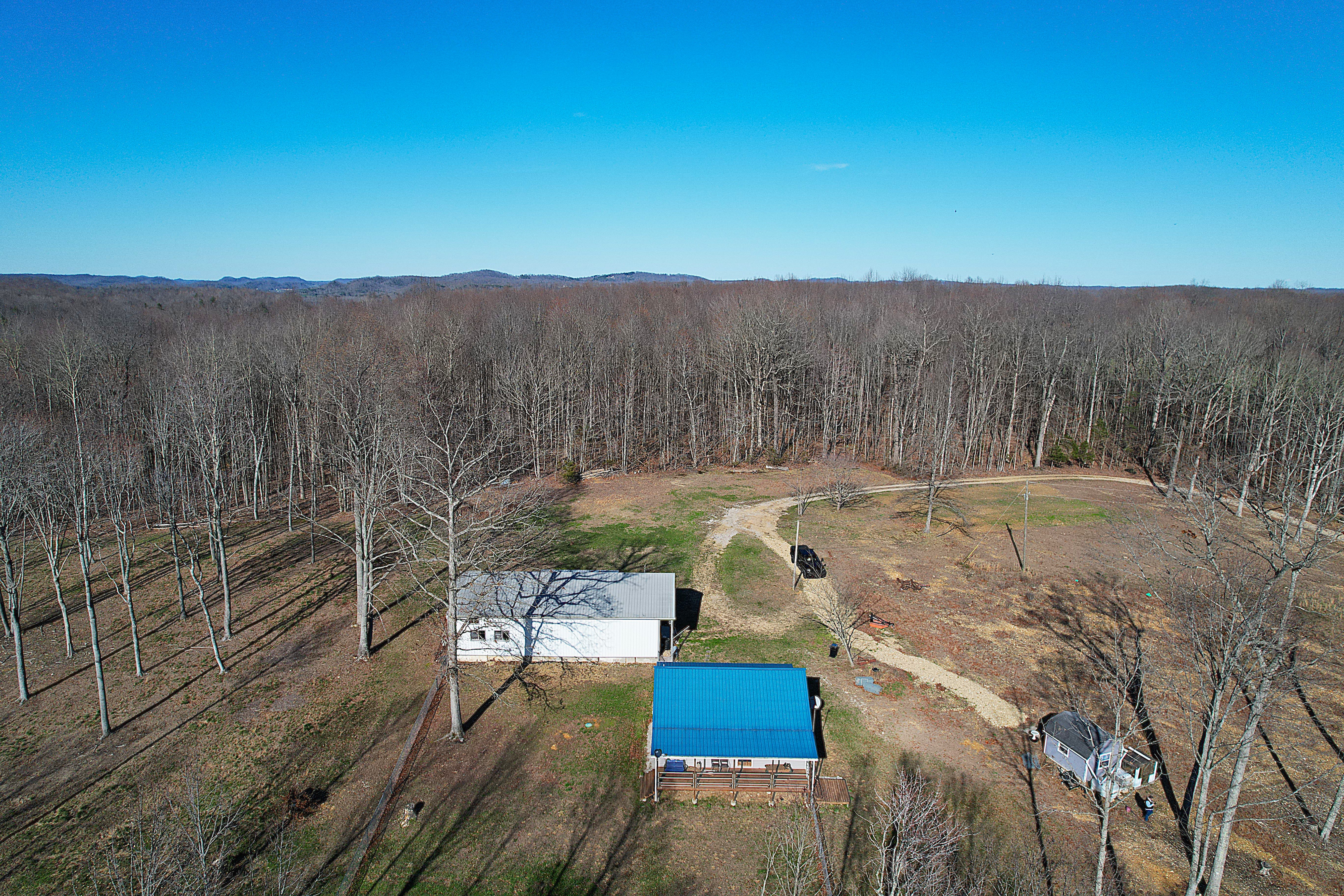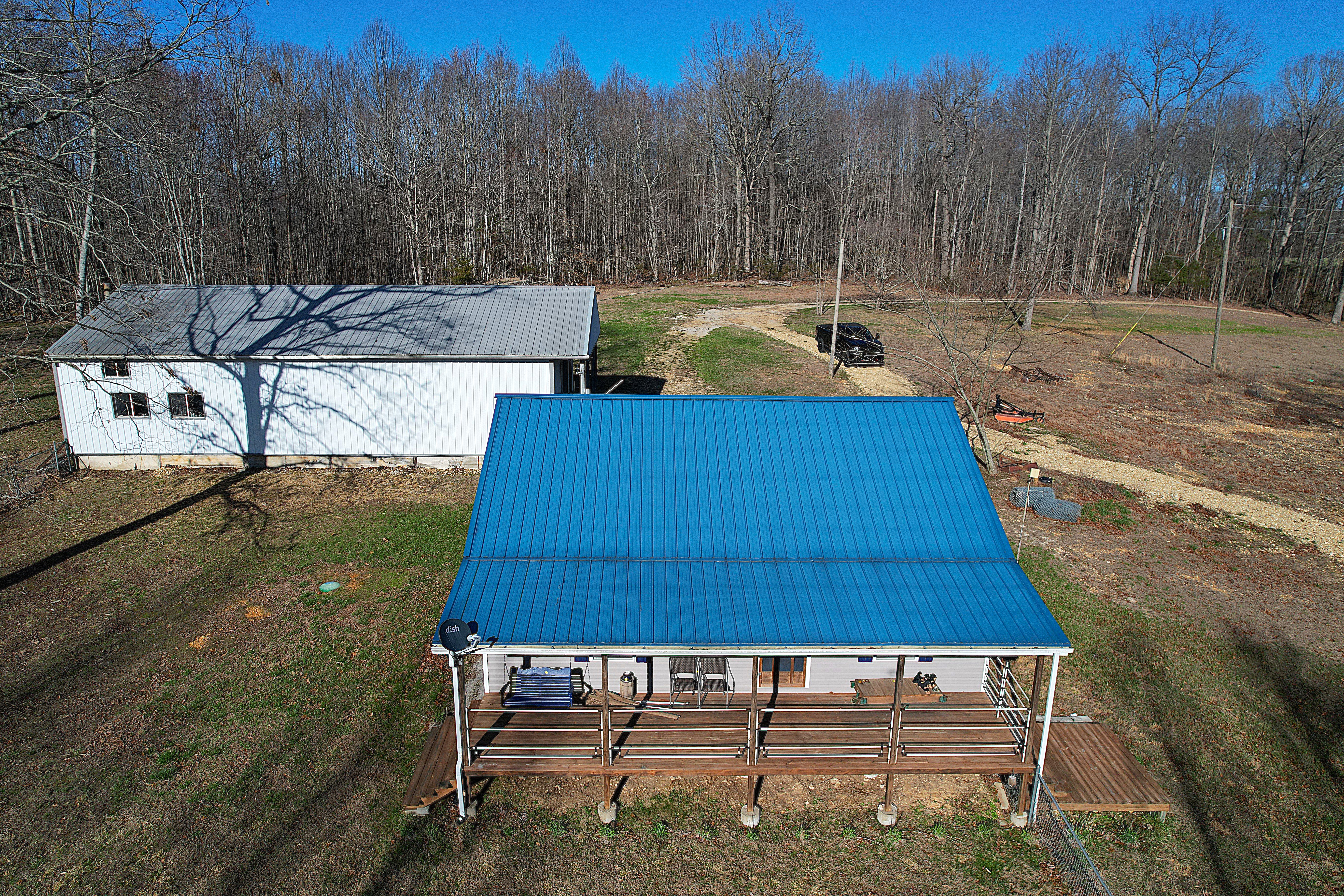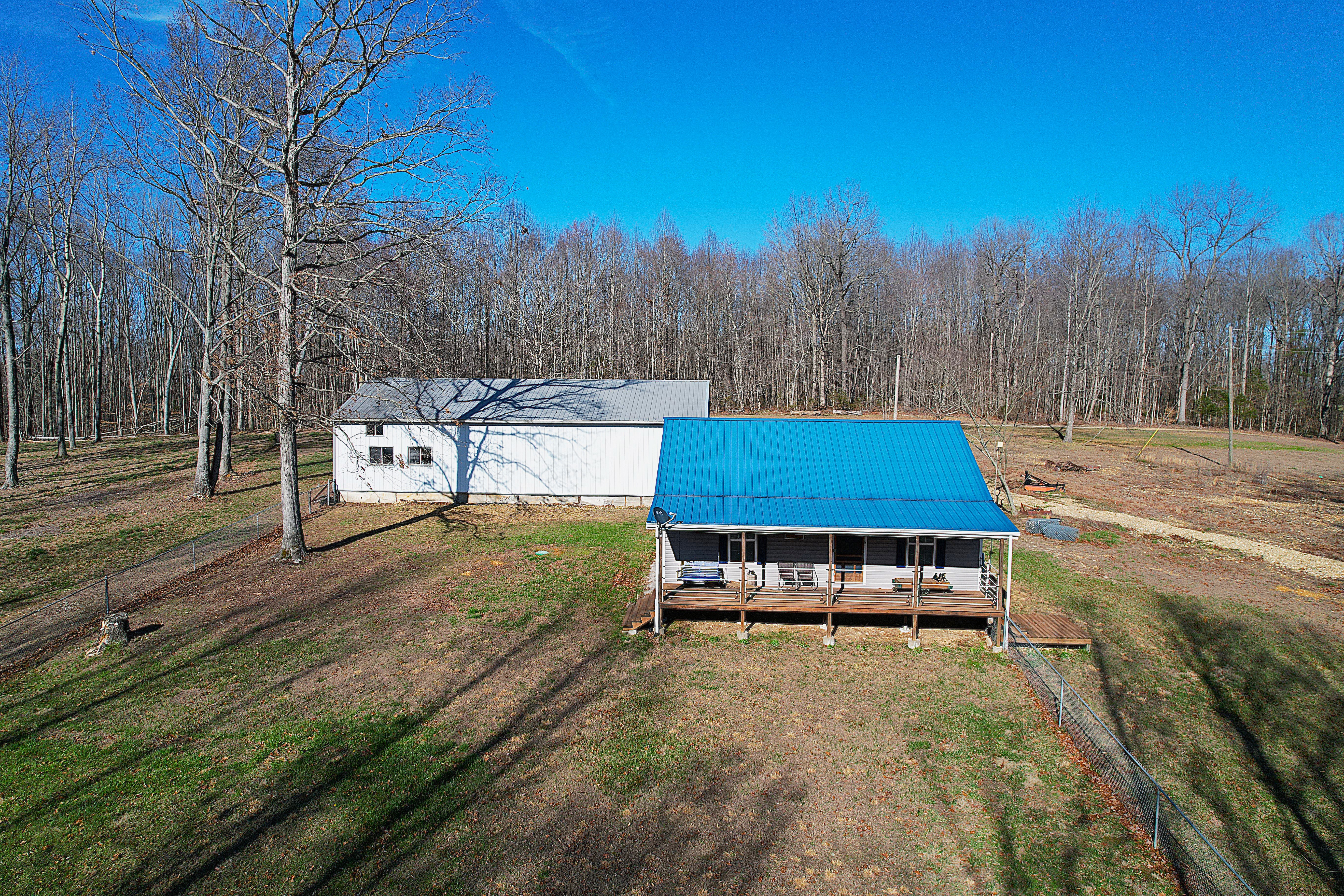 Very nice, well-kept home along with a large garage/workshop on 12.8+/- acres in Casey County Kentucky. The house has connection to electric and county water along with a mini-split unit for heating and air conditioning. The home was built in 2018 and features one bedroom and one bath with approx. 896 square feet of living space. Entering the front door leads to the open concept living room/kitchen area with plenty of room for seating and dining table. The kitchen has a stove, refrigerator and dishwasher that will remain with the property along with custom cabinets. With 12' vaulted ceilings the living space feels very spacious and gives off the country cabin vibe. Around the corner is the bedroom with space for a bedroom suite as well has having two closets. There is a full bathroom along with large laundry room at the back of the home as well. The house offers two covered porches, one on both the front and back of the home giving beautiful views of the outdoors as well as areas to see both sunrise and sunset. The garage offers plenty of space for storage as well as room for wood or metal working, mechanical space or etc. There are separate rooms in the garage with the main working/storage area at the front with a smaller room at the back and an additional closed in shed toward the east end of the building. The land is mostly wooded with clearings near the home as well as a food plot for hunting whitetail deer as well as turkey that are both abundant in the area. The driveway is part of the property but also is an easement for the adjoining land owner to access their land. If peaceful, country living is one of your priorities, you have to check this place out.