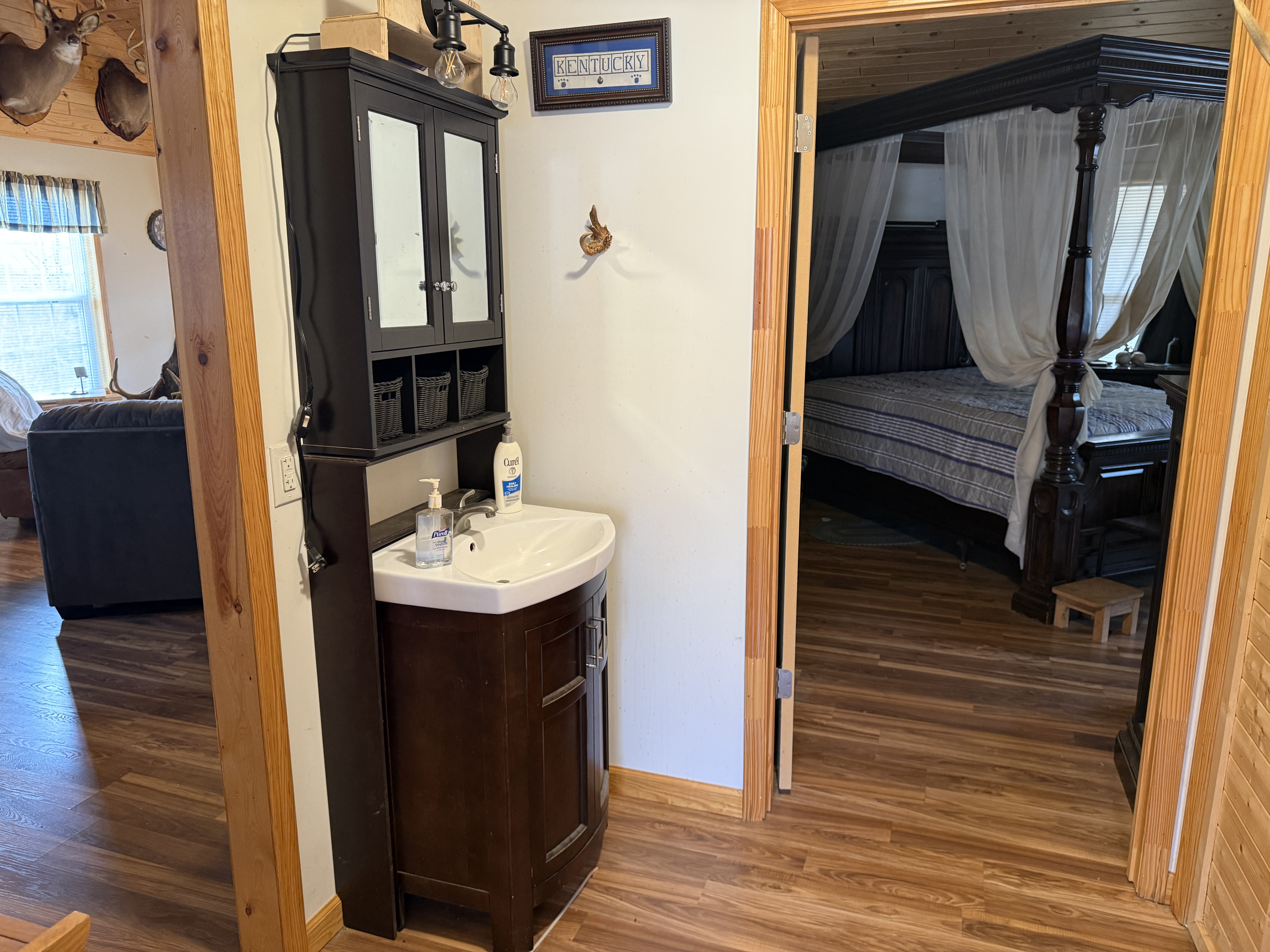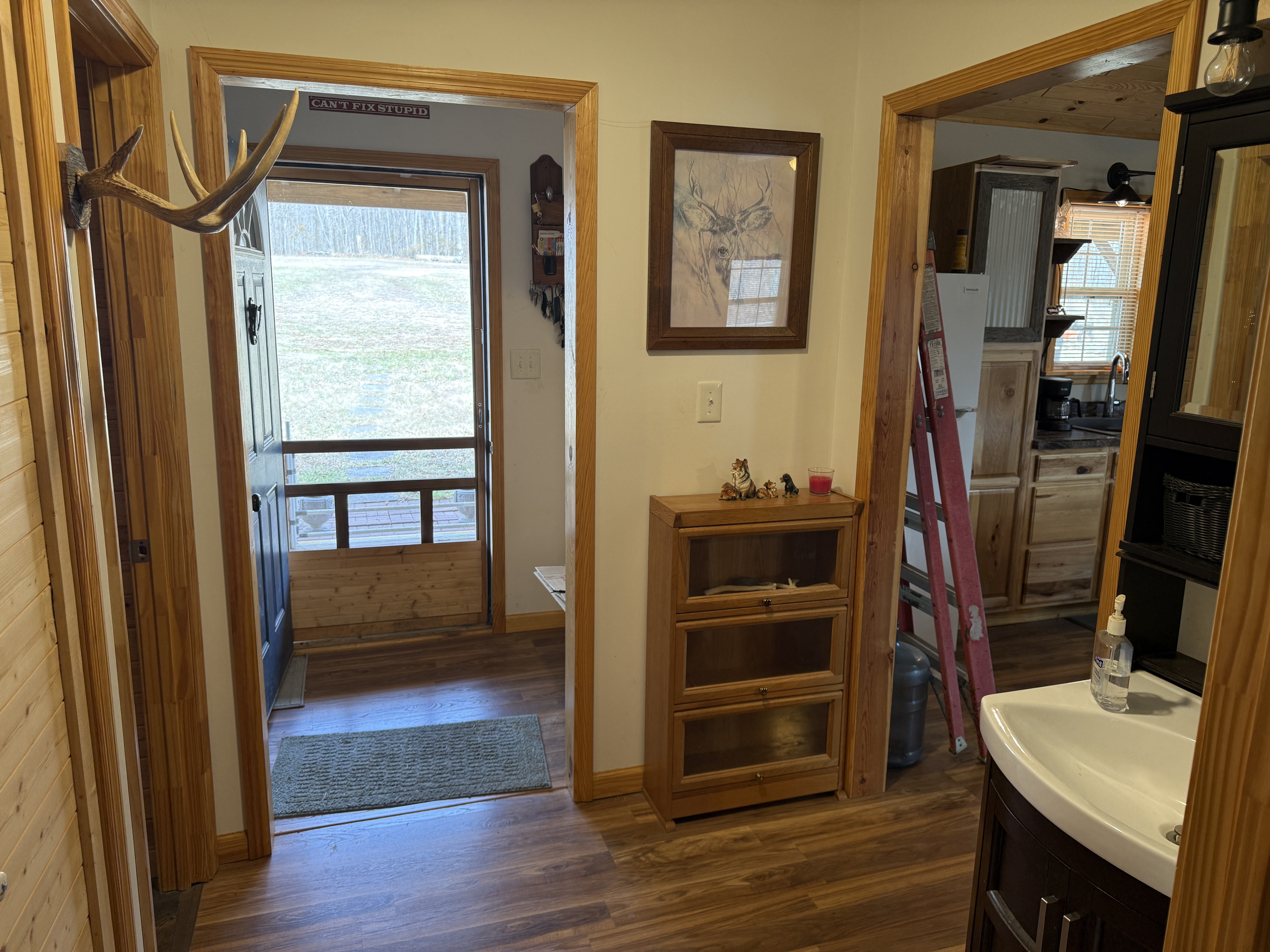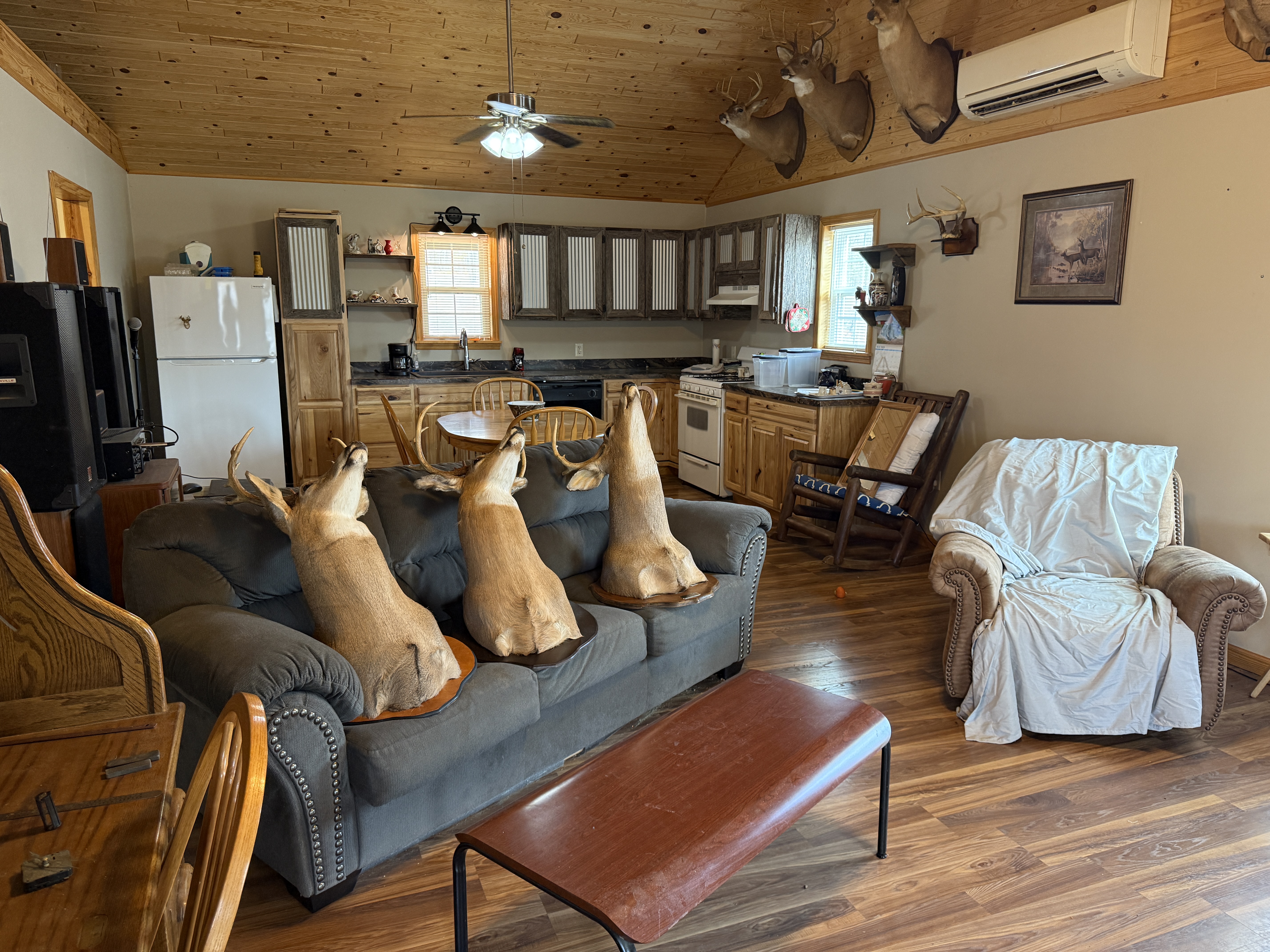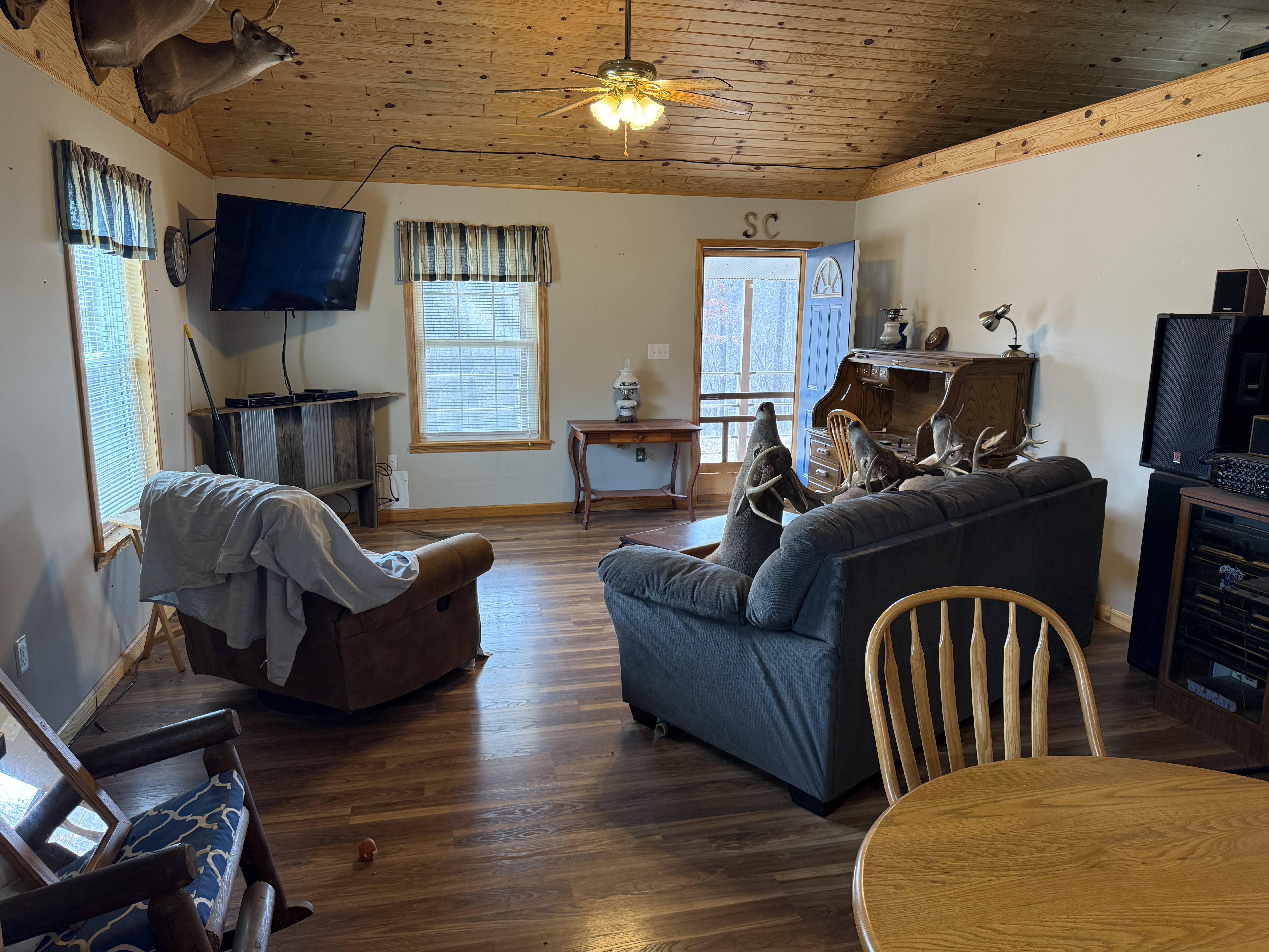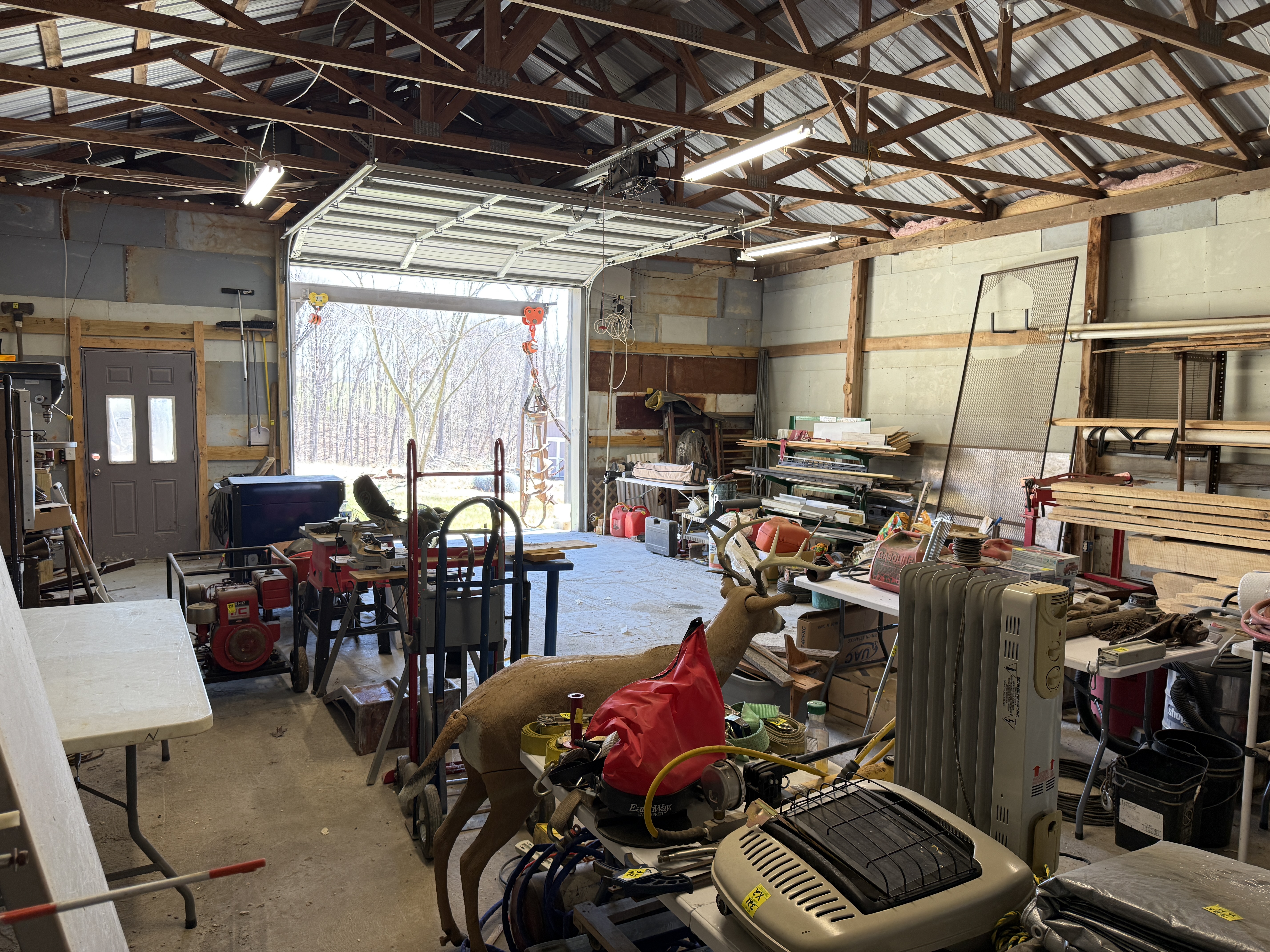 Very nice, well-kept home along with a large garage/workshop on 12.8+/- acres in Casey County Kentucky. The house has connection to electric and county water along with a mini-split unit for heating and air conditioning. The home was built in 2018 and features one bedroom and one bath with approx. 896 square feet of living space. Entering the front door leads to the open concept living room/kitchen area with plenty of room for seating and dining table. The kitchen has a stove, refrigerator and dishwasher that will remain with the property along with custom cabinets. With 12' vaulted ceilings the living space feels very spacious and gives off the country cabin vibe. Around the corner is the bedroom with space for a bedroom suite as well has having two closets. There is a full bathroom along with large laundry room at the back of the home as well. The house offers two covered porches, one on both the front and back of the home giving beautiful views of the outdoors as well as areas to see both sunrise and sunset. The garage offers plenty of space for storage as well as room for wood or metal working, mechanical space or etc. There are separate rooms in the garage with the main working/storage area at the front with a smaller room at the back and an additional closed in shed toward the east end of the building. The land is mostly wooded with clearings near the home as well as a food plot for hunting whitetail deer as well as turkey that are both abundant in the area. The driveway is part of the property but also is an easement for the adjoining land owner to access their land. If peaceful, country living is one of your priorities, you have to check this place out.